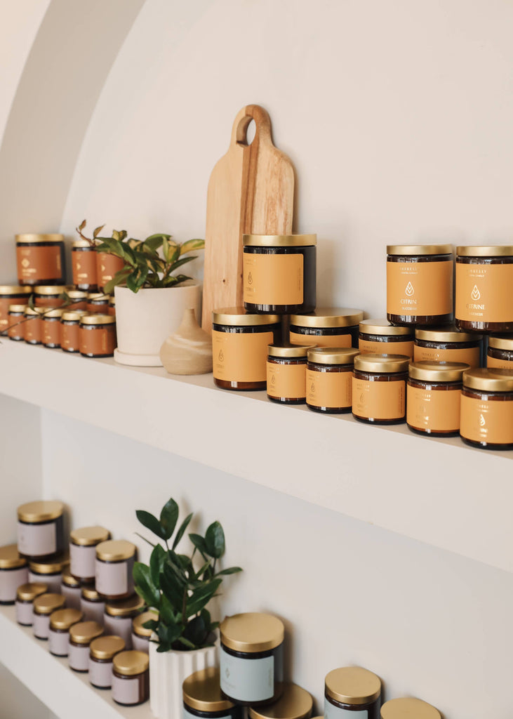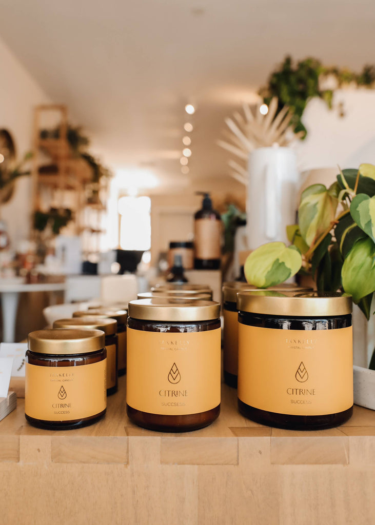 A juicy citrus blend that sparks joy—this sunny candle features notes of grapefruit and orange peel, perfect for morning rituals. Each one contains a Citrine crystal, a stone commonly associated with abundance, success, and positive energy.