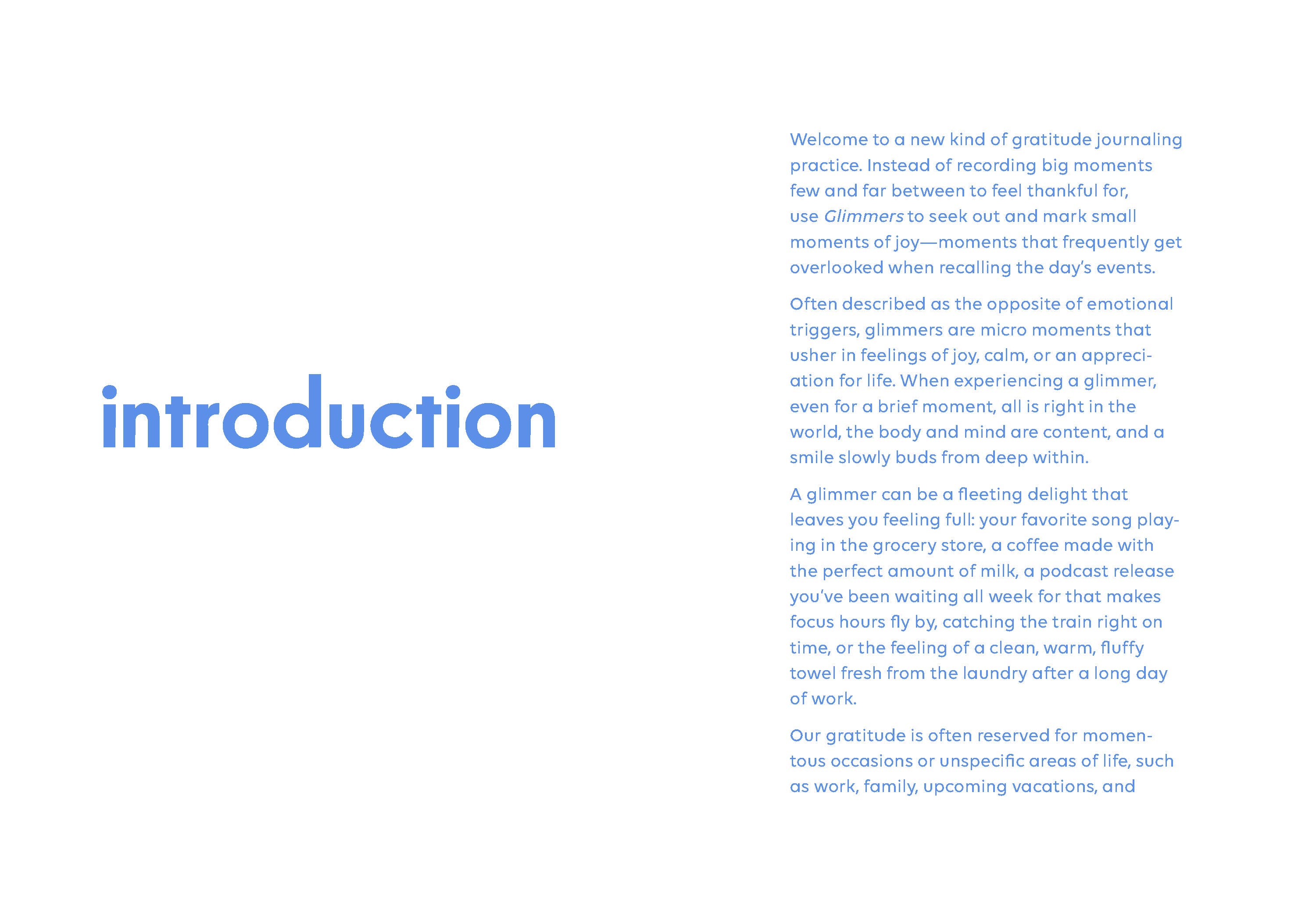 A fresh take on the gratitude journal that helps you cultivate joy every day by noticing and celebrating 'glimmers' small daily highlights that brighten your life. So often, we're accustomed to looking for joy only in momentous life events, like promotions, graduations, weddings, or significant birthdays. But if these milestones are the only joyous occasions we're paying attention to, thousands of joy-encouraging "micro-moments" can go unnoticed.Glimmers are those small moments that spark joy and comfort throughout a busy day, and this lightly guided journal is the perfect vehicle for learning to recognize them by recording and reflecting on their meaning.