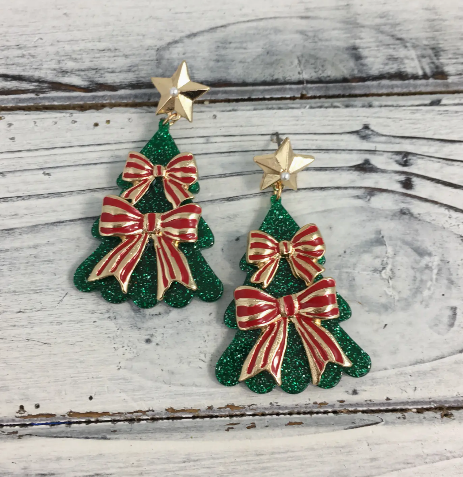 These are our Xmas tree with bows earrings! These are so classic and festive and perfect for the holiday season! These measure approximately 2 inches long. Find more in our Christmas accessories collection!