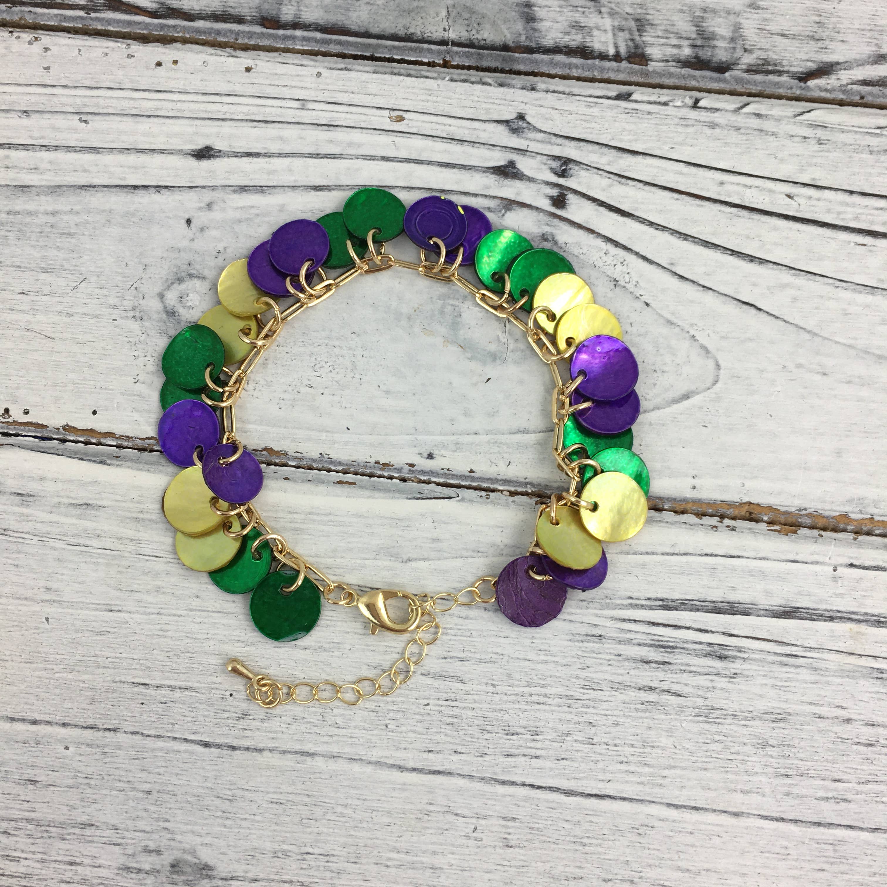 This is our gorgeous Mardi Gras shell bracelet! This item is so unique and fun and perfect for the Mardi Gras season!