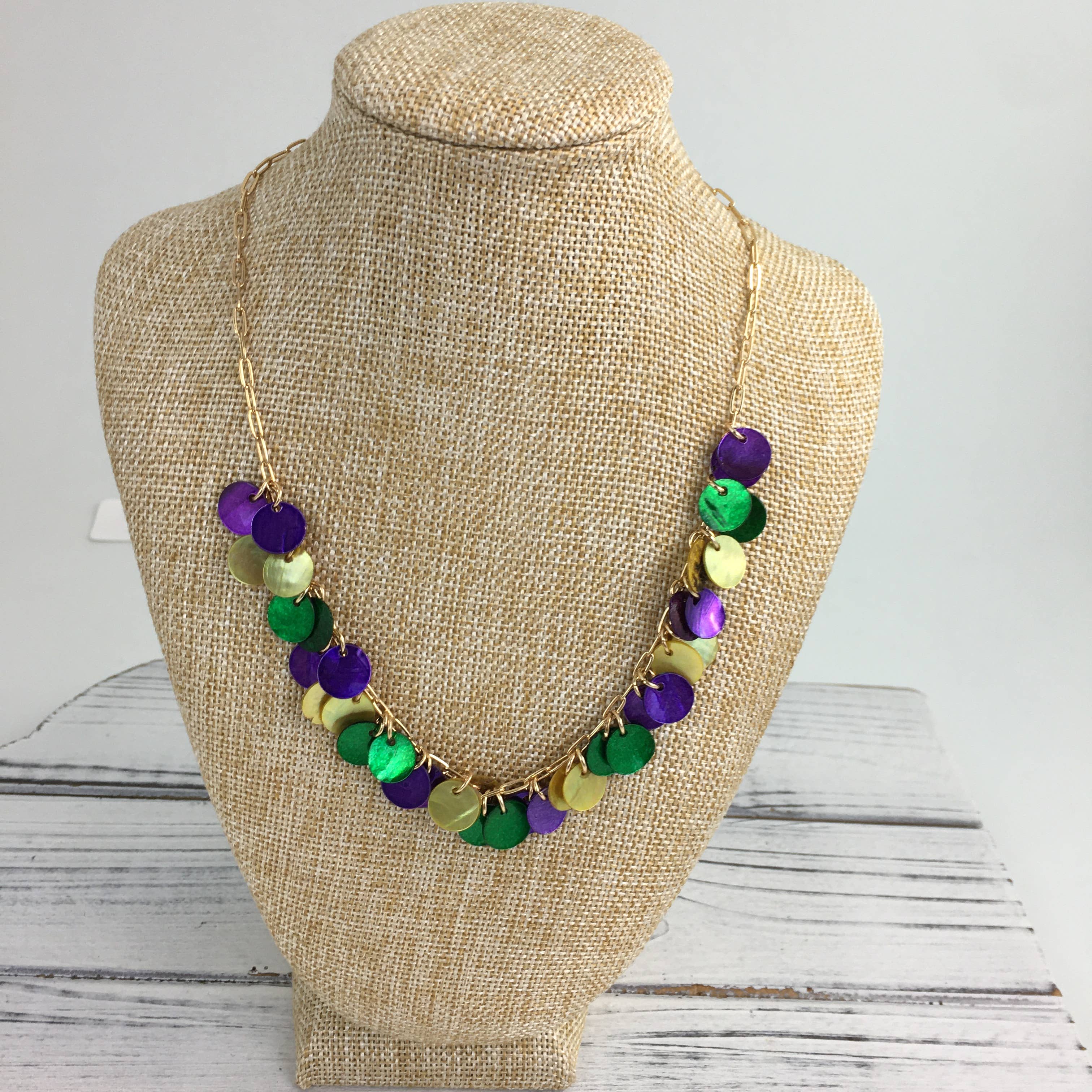 This is our gorgeous Mardi Gras shell necklace! This item is so elegant and fun and perfect for the Mardi Gras season!