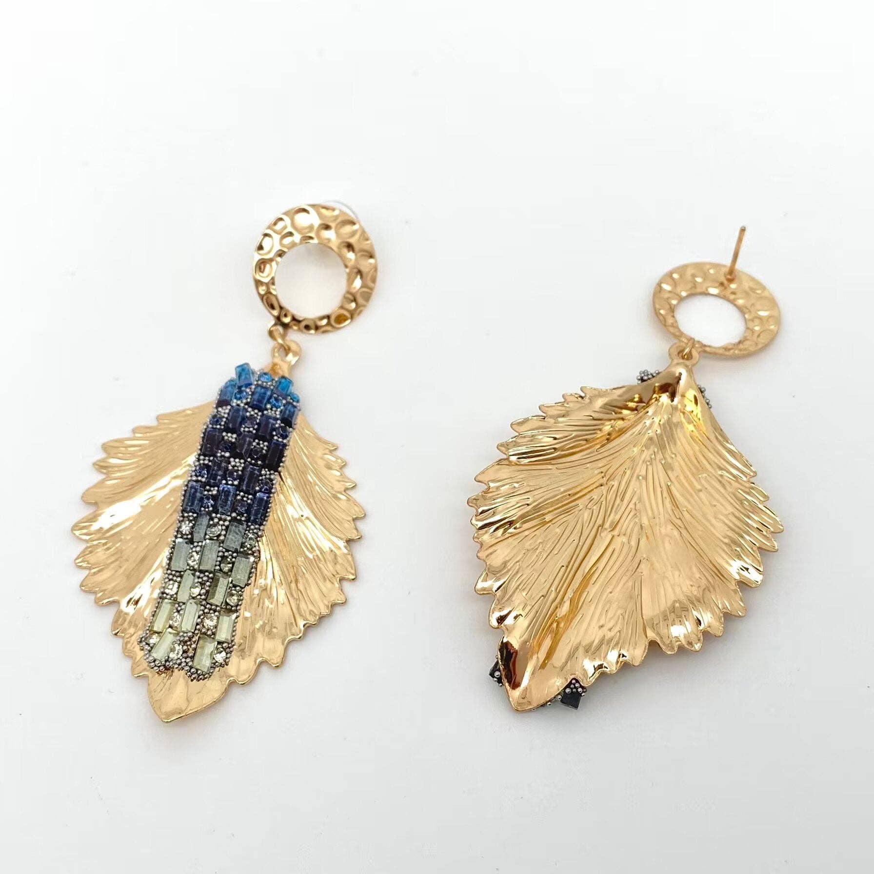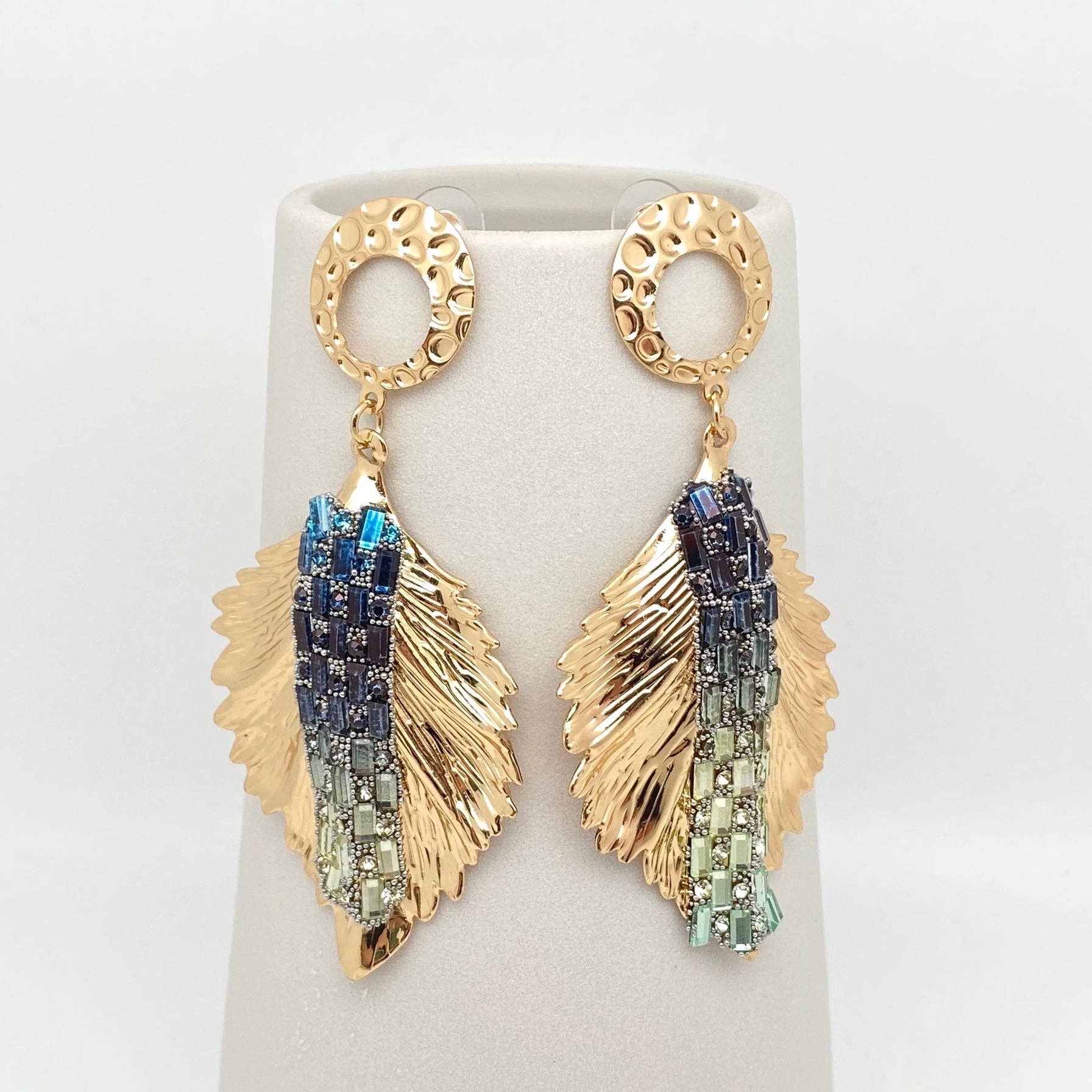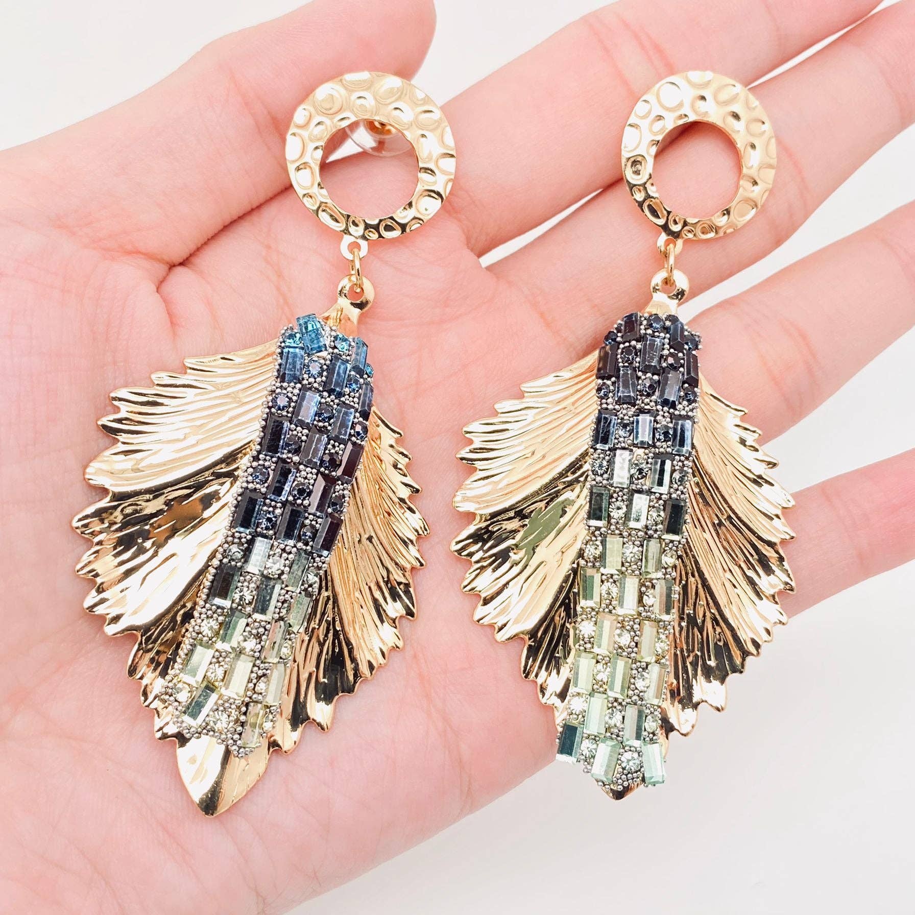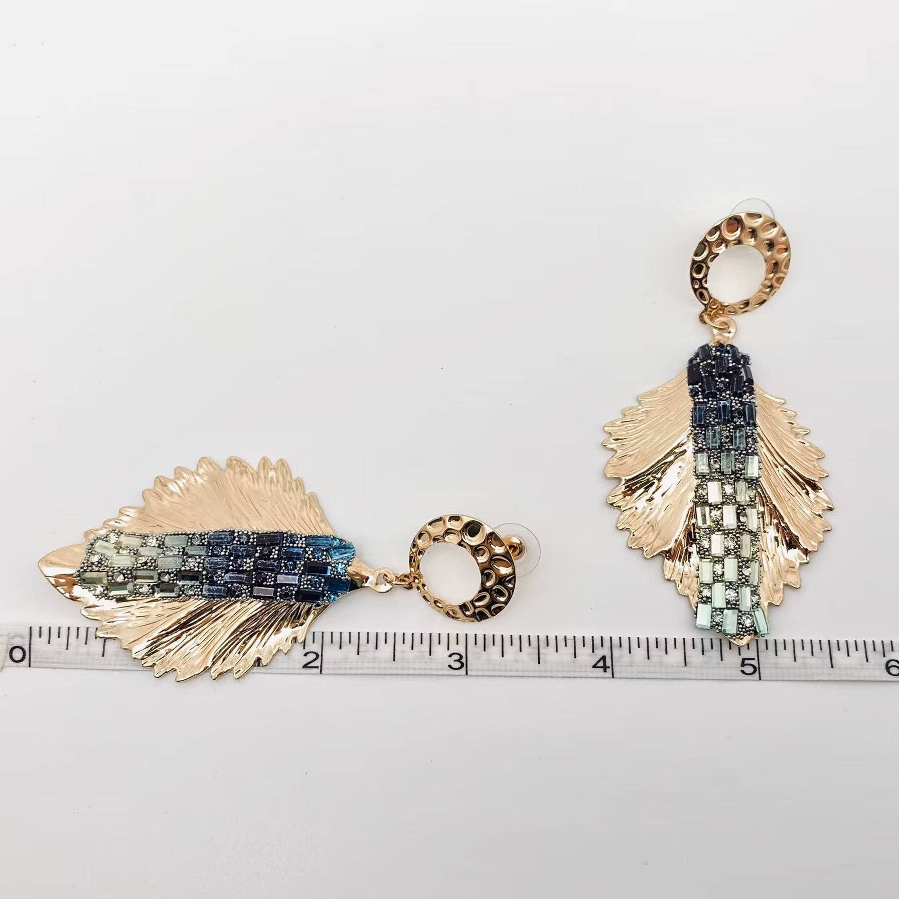 Colorful Blue Rhinestone Golden Metal Feather Pendant Earrin