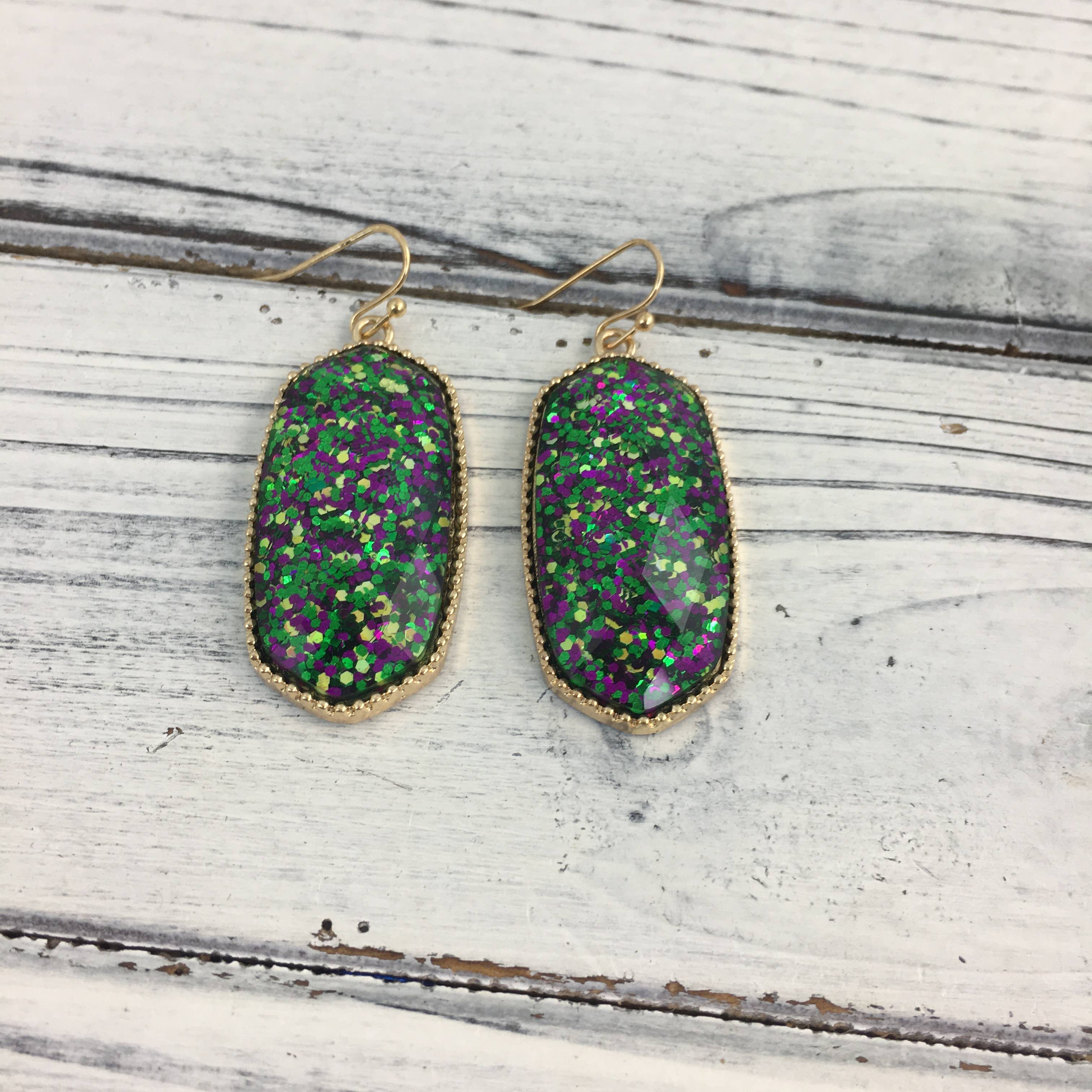 These are our gorgeous Mardi Gras confetti glitter oval earrings! These are so pretty and fun; they measure 2 inches long. Find more Mardi Gras earrings in our Mardi Gras jewelry collection!