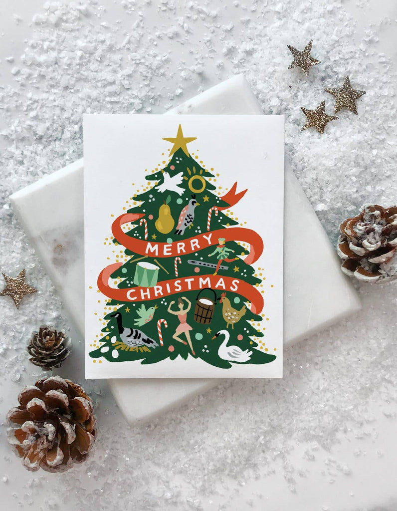A classic illustration of the Twelve Days of Christmas gifts decorates this festive tree, and sends the merriest wishes. Idlewild Co. greeting cards feature our original, hand-painted illustrations, and are printed in vibrant color on beautiful, opaque FSC-Certified papers. We pair each with a matching envelope and they are delivered in a cello sleeve–or opt in for our "naked" option, which will ship packaging free, and includes a "card clasp" removable sticker packaging. • Heavy, matte eggshell stock • Blank Inside • 4 3/4" x 5 1/2" • Paired with matching envelope
